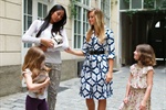 Die Kleider von Samantha Sung erfüllen die Anforderungen der Dr. Rüsch auf höchstem Niveau. Dr. Rüsch trägt das Model Audrey mit 3/4-Ärmeln im Muster Todaji Indigo. Todaji ist eines dieser Designs, zu welchen sich Samantha Sung von den Südsee-Inseln inspirieren ließ. Diese exotische Verbindung von tahitianisch inspiriertem Muster und Schnittmuster der 50-er Jahre machen diese Kleider absolut einzigartig.